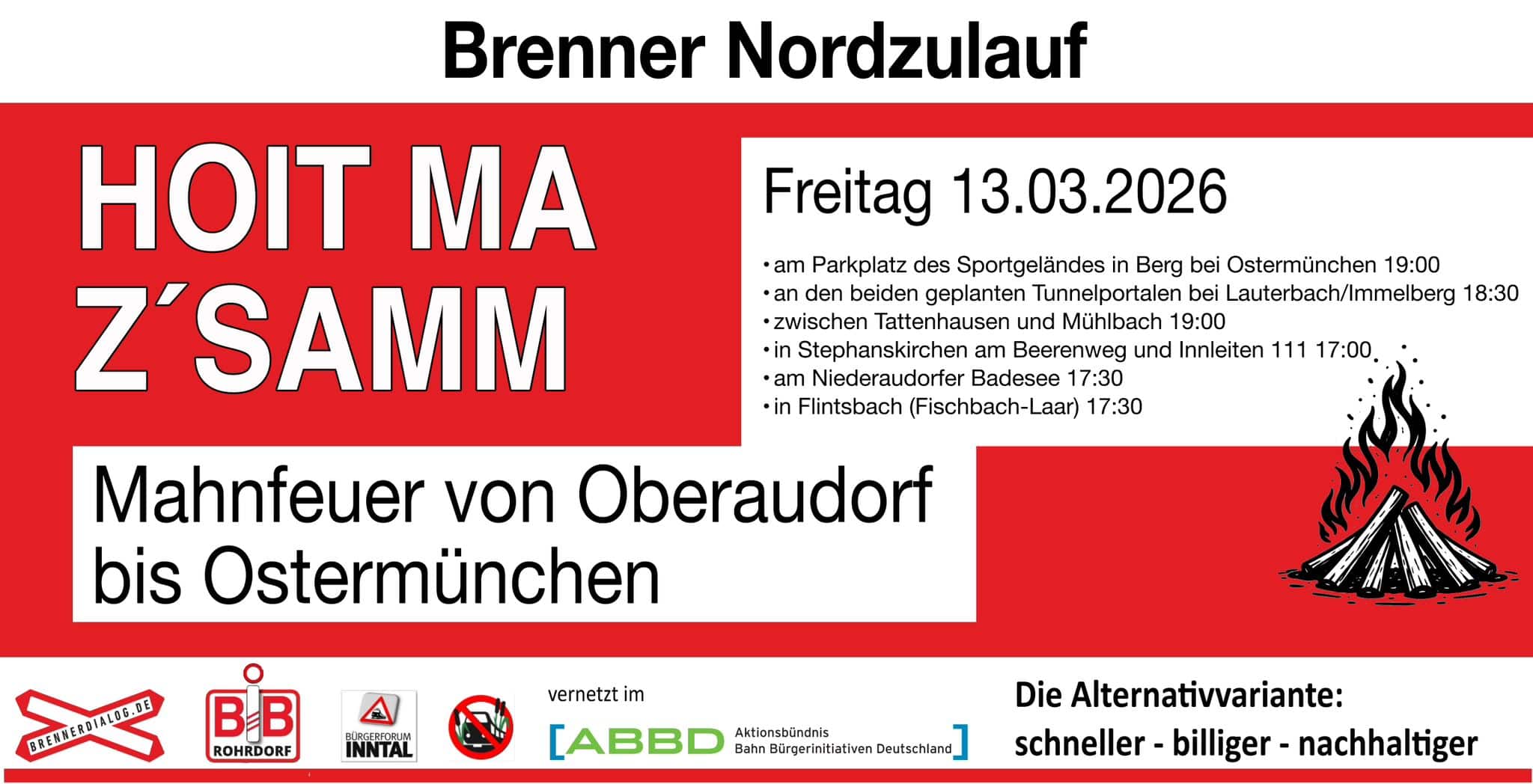 Unter dem Motto „Hoit ma z’samm“ setzen wir heute, am 13.03.2026, ein deutliches Zeichen. Entlang der Strecke von Oberaudorf bis Ostermünchen entzünden Bürgerinitiativen Mahnfeuer, um auf die Belastungen des geplanten Brenner-Nordzulaufs aufmerksam zu machen.