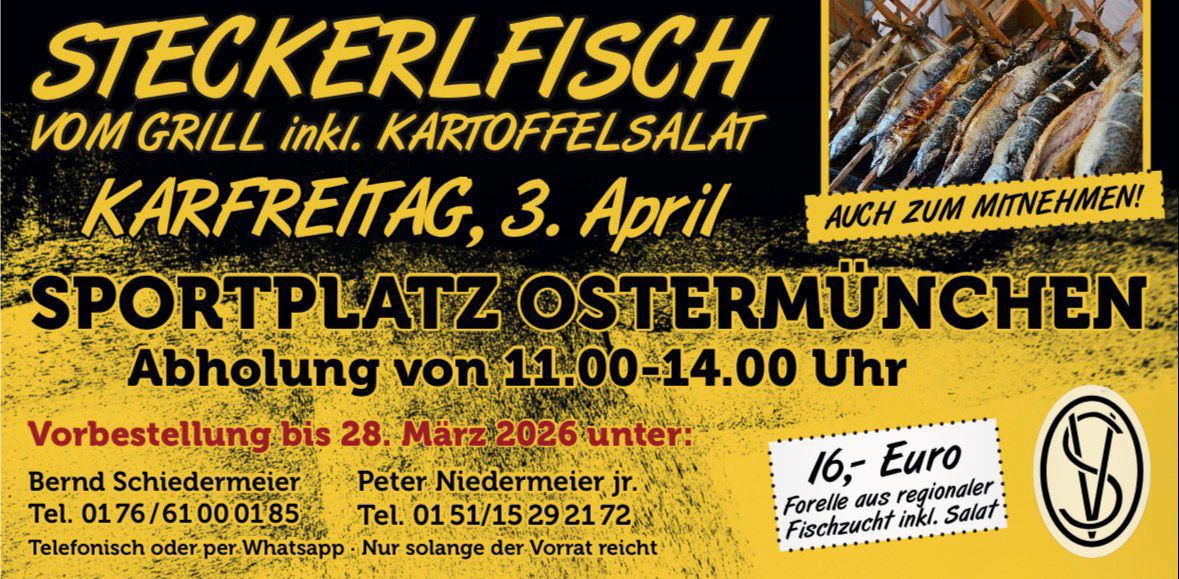 auch in diesem Jahr findet am Karfreitag, 03.04.2026, wieder unser traditionelles Steckerlfischessen am Sportplatz in Ostermünchen statt. 🎣🔥